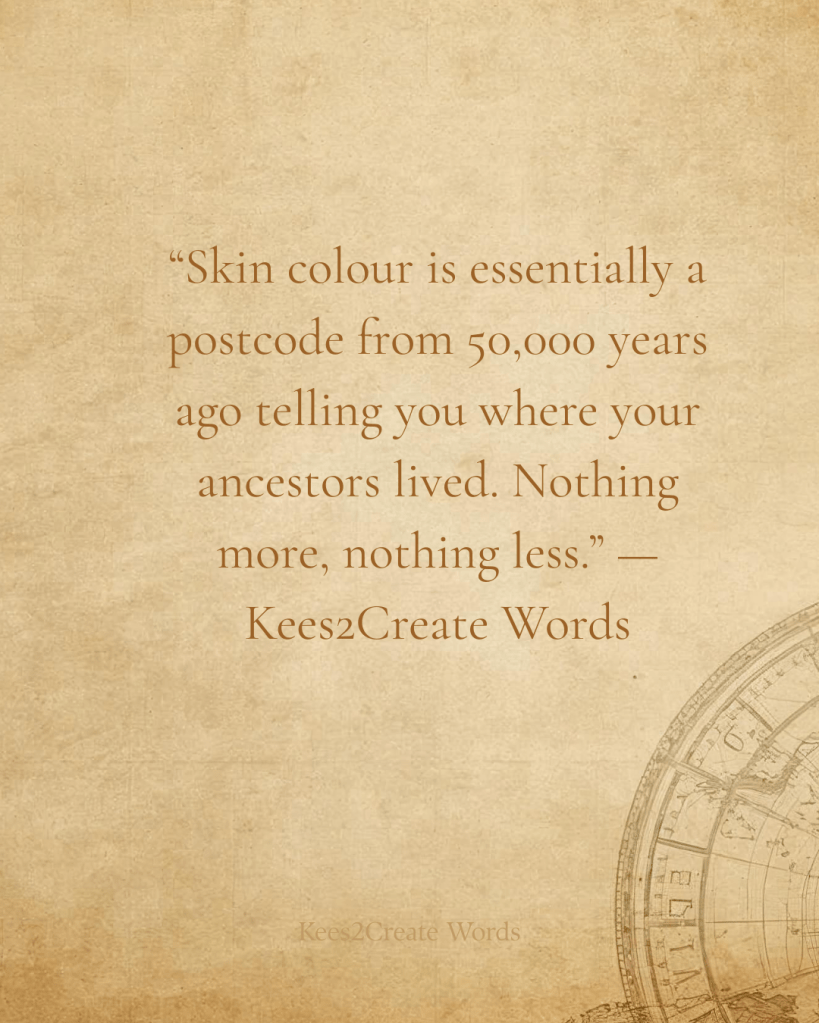 Your skin tone is essentially your ancestors’ postcode from 50,000 years ago. It tells you where they lived. Nothing more, nothing less.